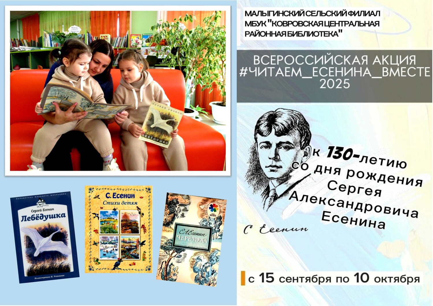 МБУК «Грайворонская детская библиотека» присоединяется к сетевой акции «Читаем Есенина вместе», приуроченной к 130-летию со дня рождения Сергея Александровича Есенина. Организатор акции - Малыгинский сельский филиал МБУК «Ковровская центральная районная библиотека».Сергей Есенин, один из самых почитаемых и любимых поэтов России, создал немало произведений не только для взрослых, но и для юных читателей. Хотя в творческом наследии Есенина стихи для детей составляют меньший объем, они занимают особое место. Поэт воспитывает в юных читателях патриотизм, любовь к родному краю и уважение к народным традициям. Есенин умело использовал поэтические образы, метафоры и народные мотивы, чтобы вызвать у детей интерес к своему творчеству и передать им свою глубокую любовь к Родине и русской природе. Предлагаем для чтения поэтические произведения Сергея Есенина: «Стихи детям», «Лебёдушка», «Черёмуха». В них вошли известные стихи великого русского поэта Сергея Александровича Есенина (1895–1925), посвящённые природе и временам года. #Грайворонскадетскаябиблиотекарекомендует Прикрепления: Картинка 1 | |